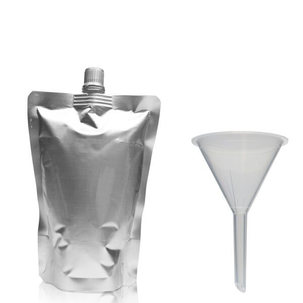 250ml Matt Silver Centre Spout Pouch With Grey Cap & Funnel