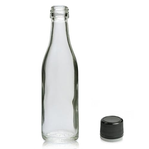 If you’re looking for a Miniature Glass Bottle With Cap which both displays and stores your flavoured gins and vodkas, then look no further than our 50ml Clear Glass Miniature Bottle With Black Tamper Evident Cap. This bottle has a classic slim base with a tall spirit bottle curved shoulder design.
