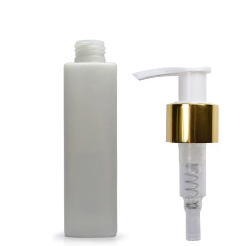 If you’re looking for a plastic bottle with a little more elegance to present your product in, then this 150ml Square Plastic Bottle & Premium Lotion Pump is definitely worth a look! Made from quality High-density polyethylene (HDPE) which is known for its excellent moisture barrier and therefore perfect for bath and beauty products. Lightweight and impact-resistant make this bottle a great choice for online businesses looking to reduce transport costs and breakages. The natural (semi-transparent) nature of the bottle gives the end-user an indication to the product colour within, whilst disguising slightly less attractive product colours. The premium lotion pump provides you with a luxurious way of dispensing your product and provides additional value to your customers. The gold really does add a little sparkle against the natural plastic HDPE.