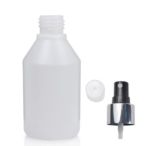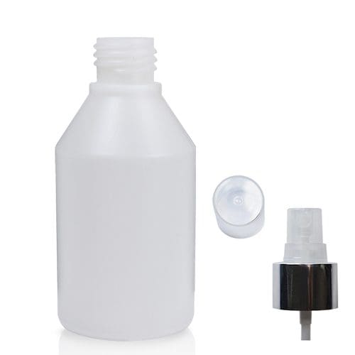 This 150ml HDPE Bottle has a 24mm wide neck, which makes it compatible with 24mm caps. This particular bottle comes with an atomiser spray but it can also be paired with our screw caps, spout caps, flip-top caps, disc top caps, lotion pumps and child-resistant (CR) caps.