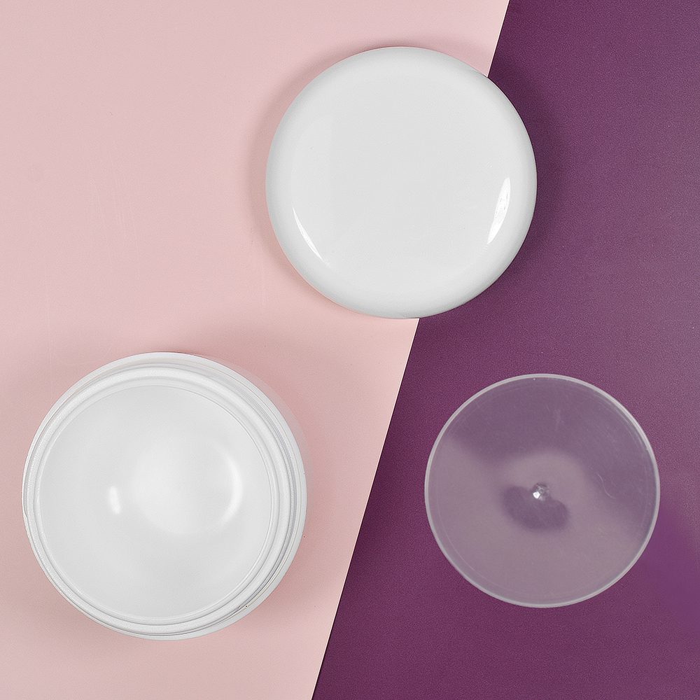 50ml white plastic cosmetic jar with matching lid and semi-transparent shive. This jar is double-walled, offering maximum protection to the contents inside. Made from a lightweight, yet robust PP Polypropylene plastic. The clear plastic shive sits in the jar neck and helps reduce leakage and wastage, perfect for creams and lotions.