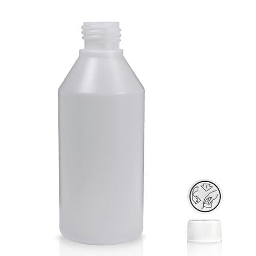 Our fully recyclable, semi-transparent 200ml HDPE Bottle is made from natural coloured high-density polyethylene (HDPE) plastic, which is a material that is well known for its many useful properties. HDPE is used extensively throughout the packaging industry due to its durability, strength, flexibility and lightweight nature. The 200ml HDPE is translucent, which means that you can faintly see the fill line of the product within through the plastic. This bottle is also food grade approved. The pairing of this bottle with our 24mm Child Resistant Cap makes it suitable for storing everyday household products that you do not want young children to be able to access.