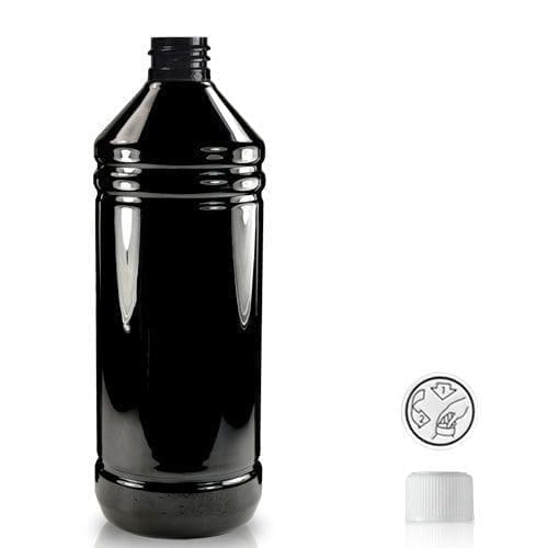 This listing is for the 1000ml black PET Bottle with a child resistant cap, but we do also offer the option to buy this bottle with a variety of our other 28mm caps. These caps include: atomiser sprays, spout caps, disc-top caps, screw caps, lotion pump caps, trigger spray caps and flip-top caps. We have this style of bottle available in both solid white PET and clear PET plastic as an alternative – View both bottles here