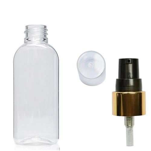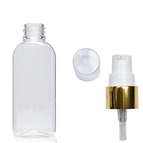 This 50ml Clear Oval Bottle & Gold Pump arrives with a choice of natural or white cap. Each bottle is made from glass-like PET plastic which has excellent benefits when compared to its glass counterpart. They are ultralightweight, shatterproof & can be fully recycled by the end-user. If you are looking to reduce your carbon footprint and reduce breakages, migrating to PET might be the answer you are searching for.